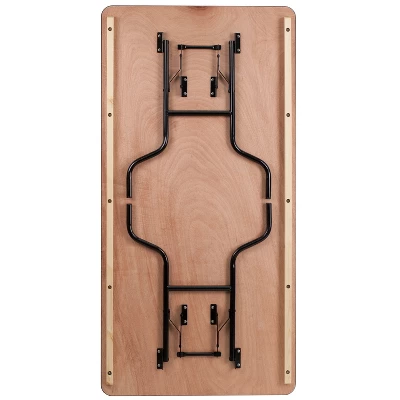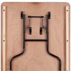 If you want a table that is sturdy, long-lasting and versatile enough to use anywhere this heavy duty folding table is as good as it gets! The Rectangular Wood Folding Banquet Table is a commercial grade table that can be used as a training table, trade show booth, or a banquet table. Featuring an Okoume hardwood surface, this table is 6 feet long, 3 feet wide and .75 inches thick, with a blackedge band. It has a 580 pound static load capacity and will seat up to 8 adults. Its durable, easy to clean tabletop is sealed with a quadruple coated polyurethane varnish. The underside of the table is finished with a double coated polyurethane varnish. Two heavy duty, wood runners, secured to the underside of the table, increase load capacity and allow for more secure stacking, transport and storage. The heavy duty wishbone legs lock securely in place when the table is in use. A black powder coating protects the legs from scratches, and non-marring floor caps protect your floor. This is a particularly good choice for party rental companies and other organizations that hold many events throughout the year. Additional Features: Two Heavy Duty Wood Runners under table allow table stacking, Black Powder Coated Locking Wishbone Legs, 18 Gauge, 1″ Diameter Steel Legs, Protective Floor Caps, Designed for Commercial Use